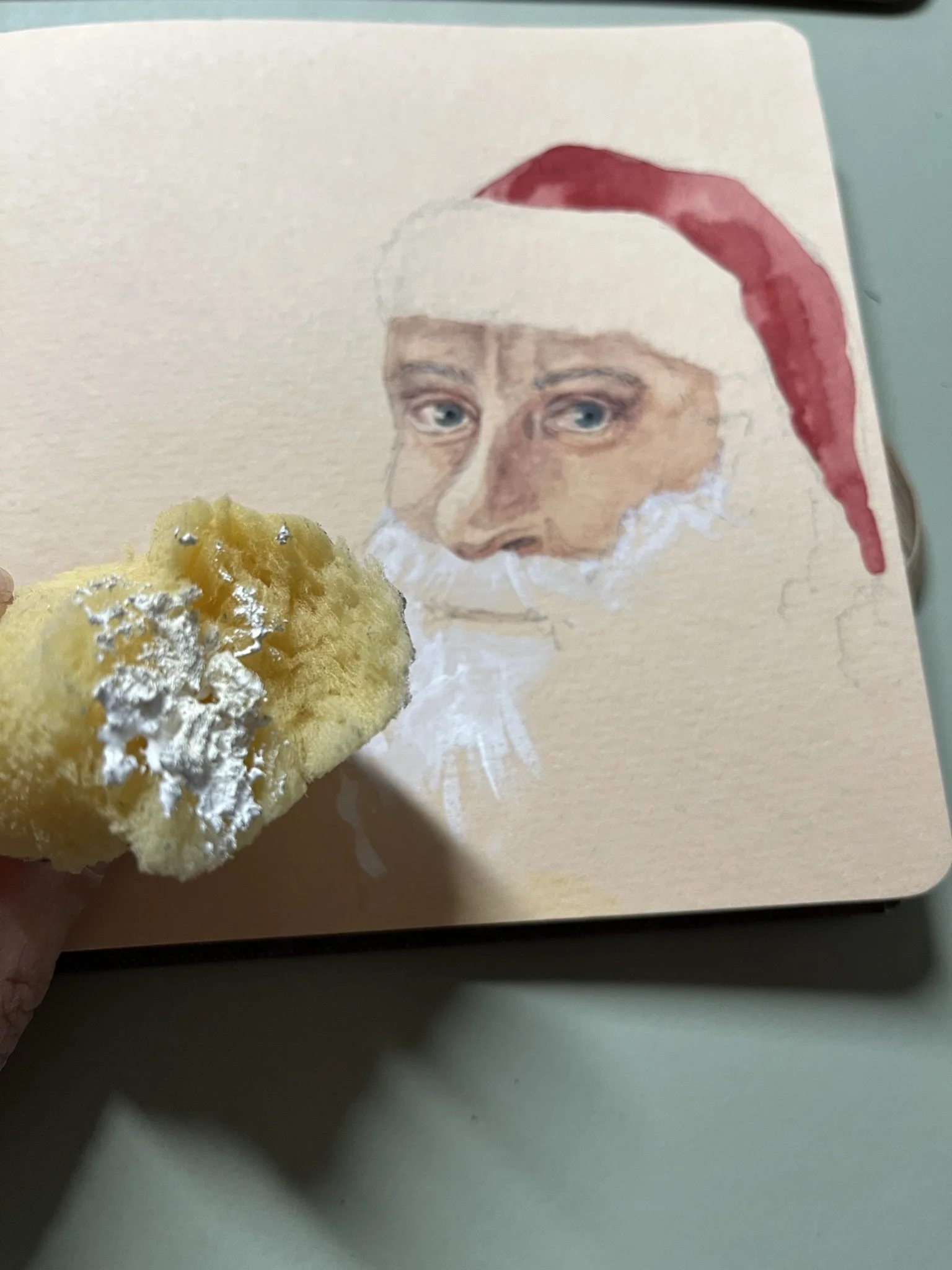 Ich habe die weiße Gouache am Bart und an der Mütze mit einem Schwamm aufgetupft.